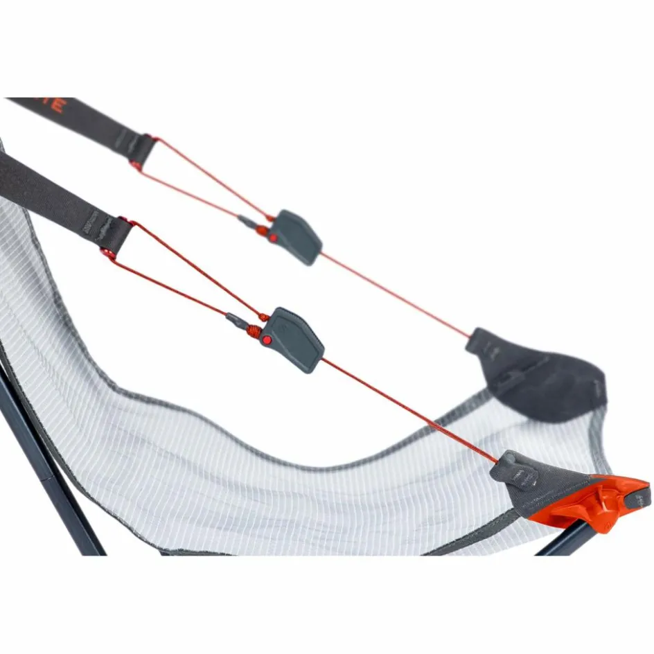 Das Seilsystem ist aus Dyneema gewoben und dementsprechend robust. Dank der Klemmstücke lässt sich die Länge des Seils und damit der Sitz-Winkel stufenlos einstellen. So hast du jede Menge angenehmen Sitzkomfort, ob weit zurückgelehnt oder aufrechter.