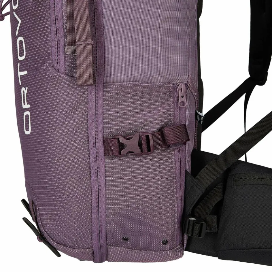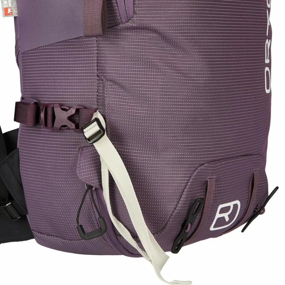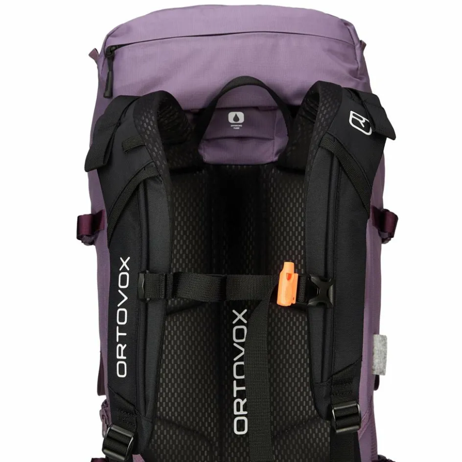 Ortovox hat dem Peak 32 S ein neues Tragesystem verpasst, das Swisswool 3D Back System. Dafür wurden Wollvlies, ergonomische Schaumeinsätze und ein 3D-geprägtes Obermaterial clever kombiniert. Das Ergebnis ist ein Kontaktrücken, bei dem du trotz des festen, körpernahen Sitzes ein trockenes Tragegefühl hast. Denn an allen Kontaktpunkten befinden sich Wollpads und Wolle hat den Vorteil, dass sie bis zu 30 Prozent ihres Eigengewichts an Feuchtigkeit aufnehmen kann. Die Wollpads kommen übrigens auch an Schulter- und Hüftgurten zum Einsatz.