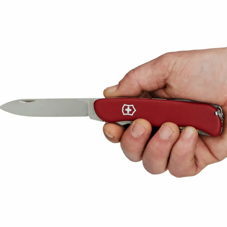 Alles dabei, um auch unterwegs genießen zu können – von Flaschenöffner bis Korkenzieher. Die 11 cm große Klinge des Schweizer Offiziersmessers arretiert nach dem Aufklappen automatisch.
