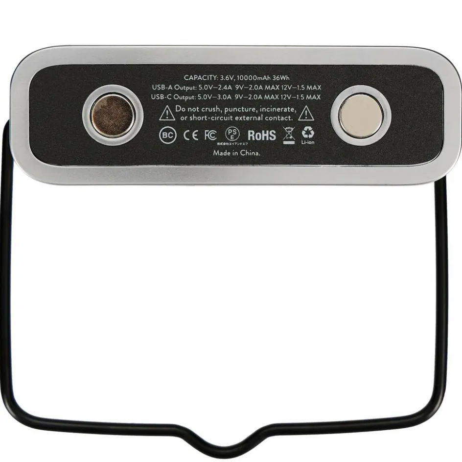 Die Barebones Powerbank bietet vielseitige Anwendungsmöglichkeiten. Du kannst sie am Bügel aufhängen (zum Beispiel, um eine Lichterkette zu betreiben), aufstellen, hinlegen oder mithilfe der zwei im Fuß integrierten Magnete an jeder Stahlkonstruktion (zum Beispiel am Auto oder an einer Metallstange) befestigen.