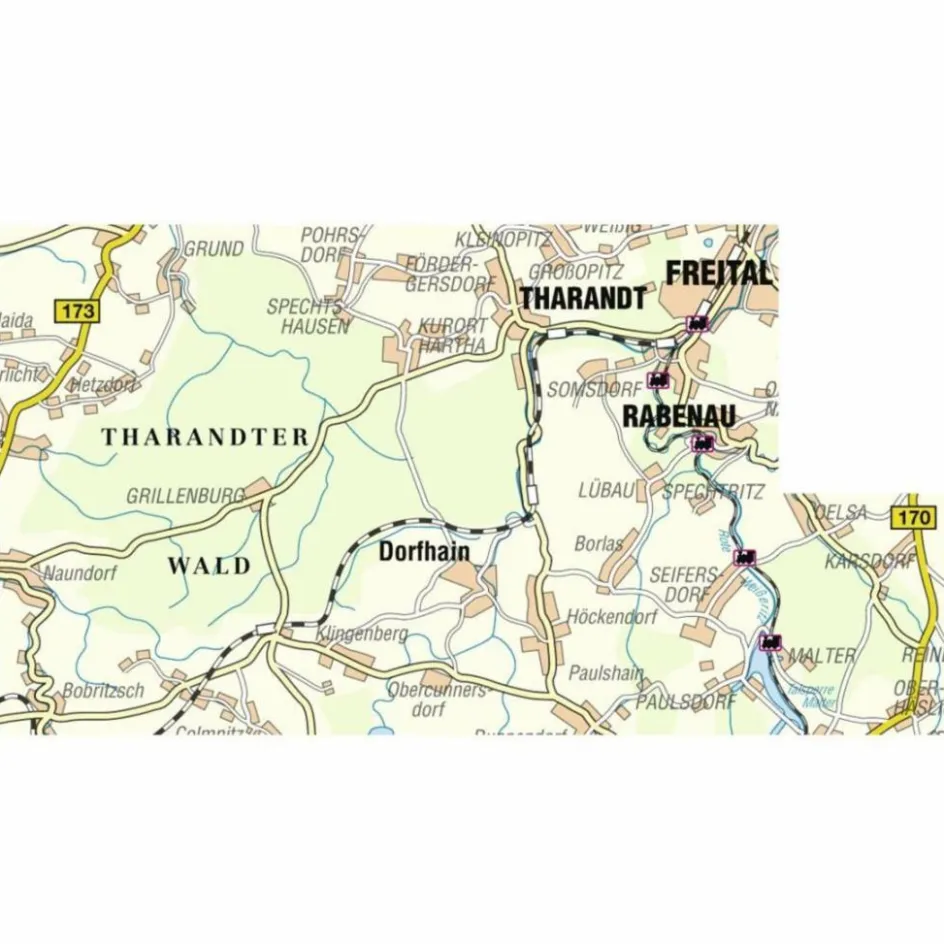 Umfasst das Gebiet des Tharandter Waldes sowie den Rabenauer Grund mit den Ortschaften Tharandt, Rabenau, Höckendorf und Dorfhain. Beinhaltet alle markierten Wanderwege als auch Radwege mit deren Kennzeichnung sowie die Pilgerwege.Der ENSO-Energie-Erlebnispfad ist komplett dargestellt.Durch die Darstellung der naturkundlichen, geologischen und historischen Informationen wird der Kartennutzer auf die großen und kleinen Sehenswürdigkeiten rechts und links des Weges aufmerksam gemacht.Auf der Kartenrückseite finden sich Text und Bild zu dem dargestellten Gebiet.