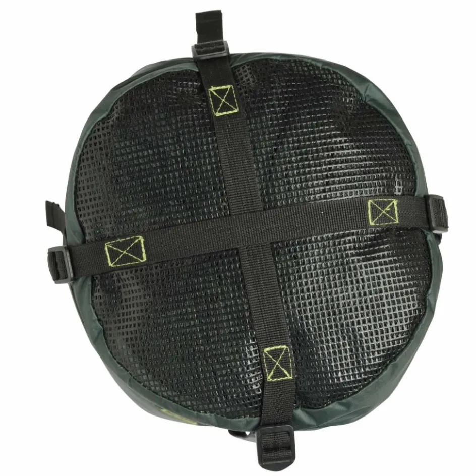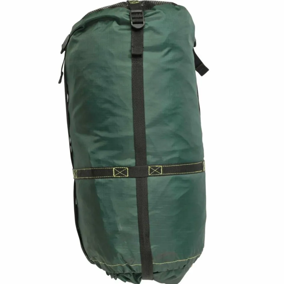 Schönes Detail: Die 4 Abspannleinen des integrierte Tarps haben eigene kleine Fächer in den Ecken, die sich mit Klett verschließen lassen. Dort hinein lassen sich die Leinen praktischerweise verpacken. Der Packbeutel hat einen Netzboden; eventuell enthaltene Feuchtigkeit kann hier entweichen. Auch das Verpacken der Traveller Camp in den Packbeutel fällt dadurch leichter.