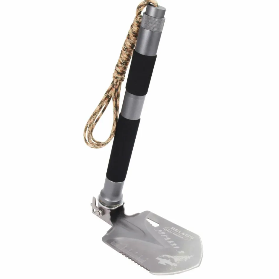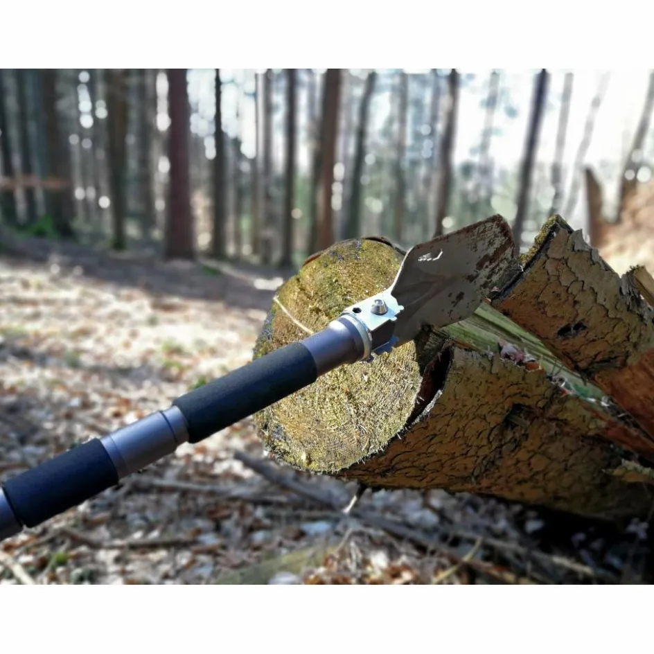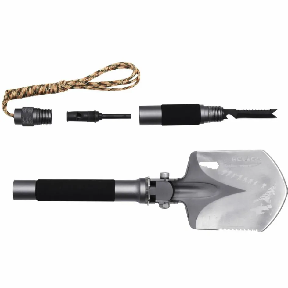 Klappschaufel aus Edelstahl, mit der du nicht nur den Spatengang verrichten kannst. Ausgestattet mit einer Hack- und Sägefunktion und praktischen Helfern, wie Schraubenschlüssel und Notfallpfeife.