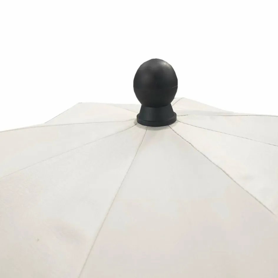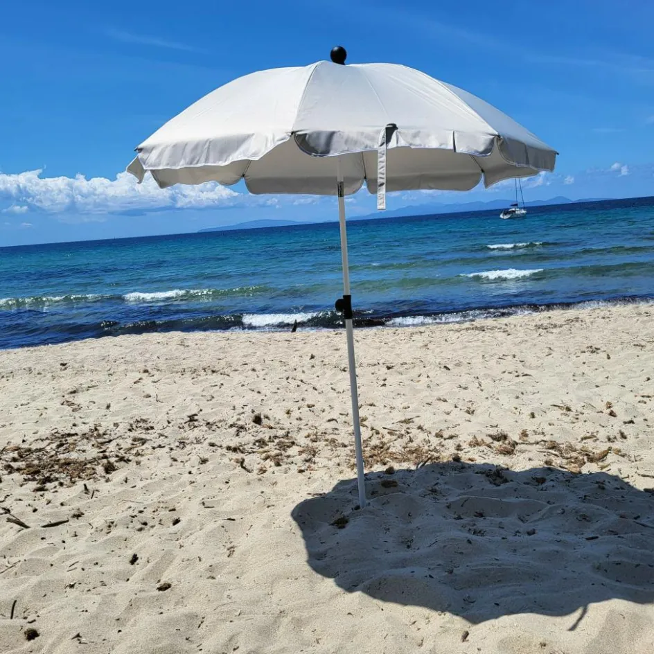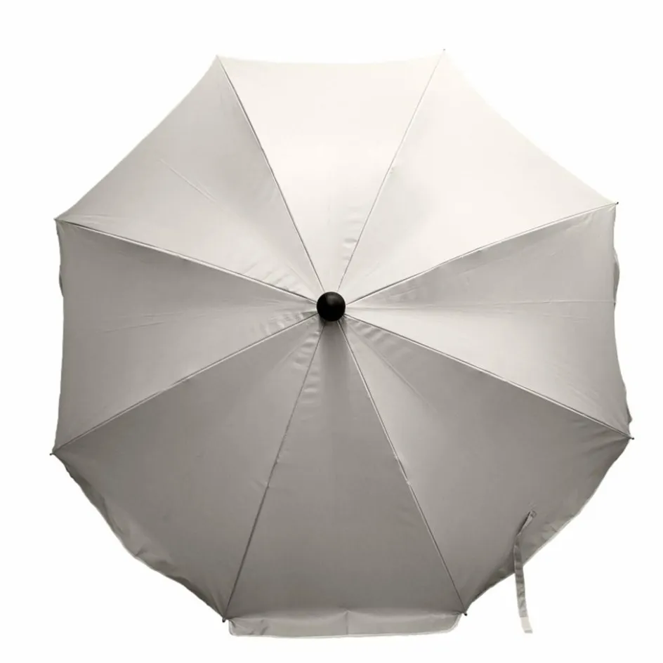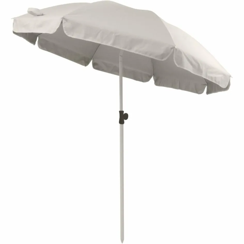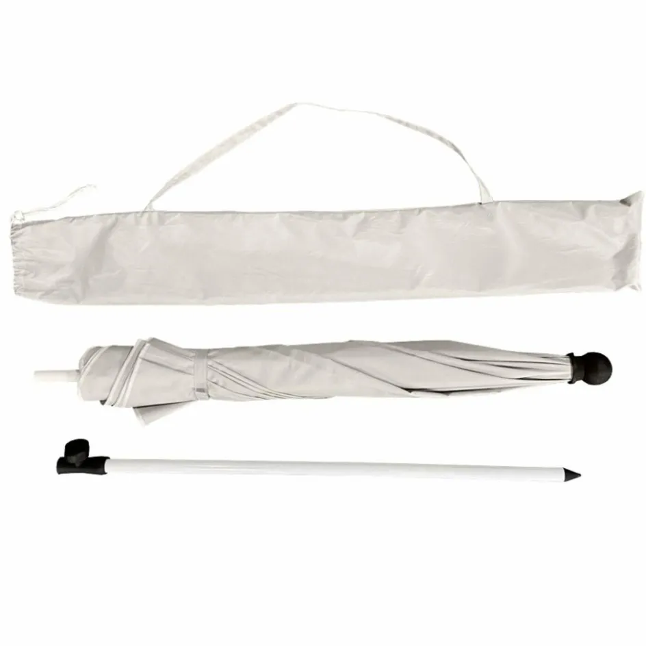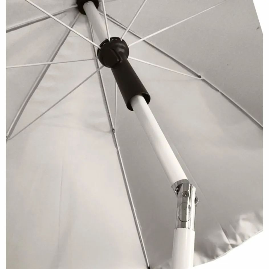 Einfacher Sonnenschirm mit 180 cm Durchmesser. Die Bespannung aus Polyester ist mit einer Silberbeschichtung versehen und erreicht damit einen Sonnenschutzfaktor von UPF 50+.