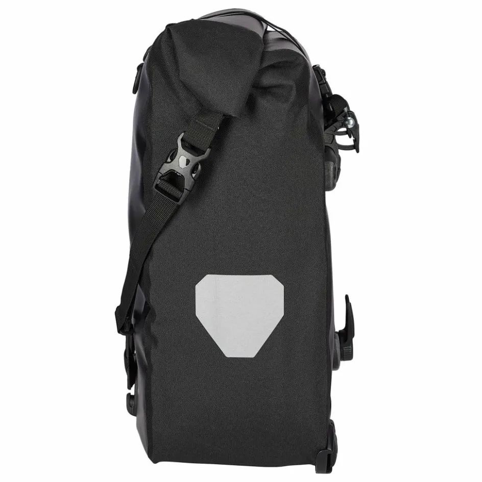 Aufhängung für Gepäckträger mit einem Rohrdurchmesser von 8 bis 16 mm. Beim QL2.1-System wurde die Schiene mit den Befestigungshaken an der Taschenrückseite überarbeitet. Die beiden oberen Haken lassen sich werkzeugfrei auf der nun aus einem Stück gefertigten Schiene verschieben und durch Anheben des Tragegriffs öffnen. Der untere Arretierungshaken ist ebenfalls auf einer halbelliptischen Schiene individuell anpassbar und werkzeugfrei in 15°-Schritten drehbar. Ein Scheuerschutz im unteren Bereich der Taschen und an der Auflagefläche des Gepäckträgers beugt Abrieb vor.