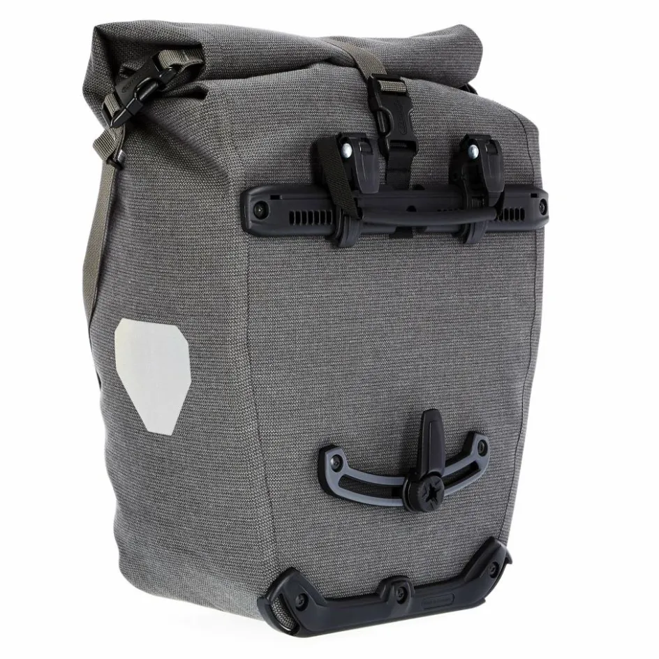Aufhängung für Gepäckträger mit einem Rohrdurchmesser von 8 bis 16 mm. Beim QL2.1-System wurde die Schiene mit den Befestigungshaken an der Taschenrückseite überarbeitet. Die beiden oberen Haken lassen sich werkzeugfrei auf der nun aus einem Stück gefertigten Schiene verschieben und durch Anheben des Tragegriffs öffnen. Der untere Arretierungshaken ist ebenfalls auf einer halbelliptischen Schiene individuell anpassbar und werkzeugfrei in 15°-Schritten drehbar. Ein Scheuerschutz im unteren Bereich der Taschen und an der Auflagefläche des Gepäckträgers beugt Abrieb vor.