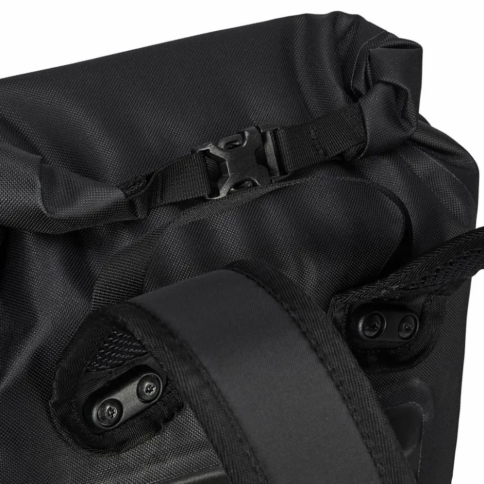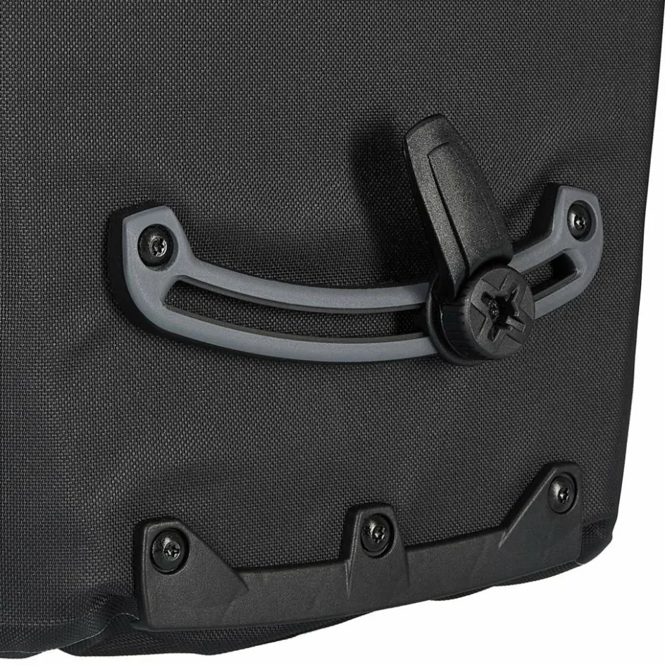 Aufhängung für Gepäckträger mit einem Rohrdurchmesser von 8 bis 16 mm. Die beiden oberen Haken lassen sich werkzeugfrei auf der aus einem Stück gefertigten Schiene verschieben und durch Anheben des Tragegriffs öffnen. Der untere Arretierungshaken ist ebenfalls auf einer halbelliptischen Schiene individuell anpassbar und werkzeugfrei in 15-Grad-Schritten drehbar. Ein Scheuerschutz im unteren Bereich der Taschen und an der Auflagefläche des Gepäckträgers beugt Abrieb vor.