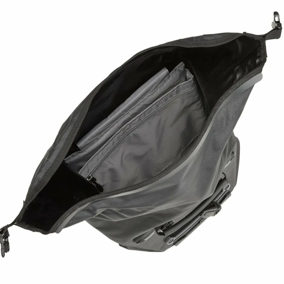 Der flexible Deckel ist mittig an der Seite und am Boden der Vario Lite beweglich angeschlagen. Entweder deckt das Flap also das QuickLock 2.1 System ab, oder aber die Tragegurte. Der Clou: Du kannst es von der einen Seite auf die andere Seite in Sekunden umklappen und fixieren. Fertig ist die Fahrradtasche, respektive der Rucksack! Einfacher kann man samt Tasche gar nicht vom Drahtesel auf Schusters Rappen wechseln. Das Flap schützt jeweils die abgedeckte Seite. Und es bewahrt dich vorm Schmutz, der eventuell vom Hinterrad an deine Packtasche geschleudert wurde.