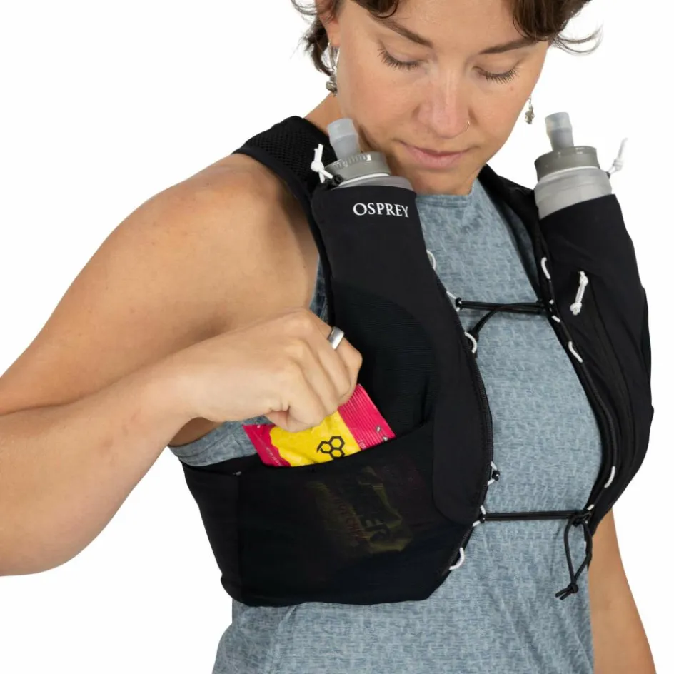 Zwei 500 ml Softflasks sorgen dafür, dass du stets mit Flüssigkeit versorgt bleibst. Für Energieriegel oder die Stirnlampe gibt es zudem zwei Steckfächer auf der Brust und auch das Smartphone ist dank des RV-Fachs immer schnell zur Hand. Für wechselhaftes Wetter bietet die Laufweste zudem ein Steckfach am Rücken, in dem du eine leichte Regenjacke verstauen kannst.
