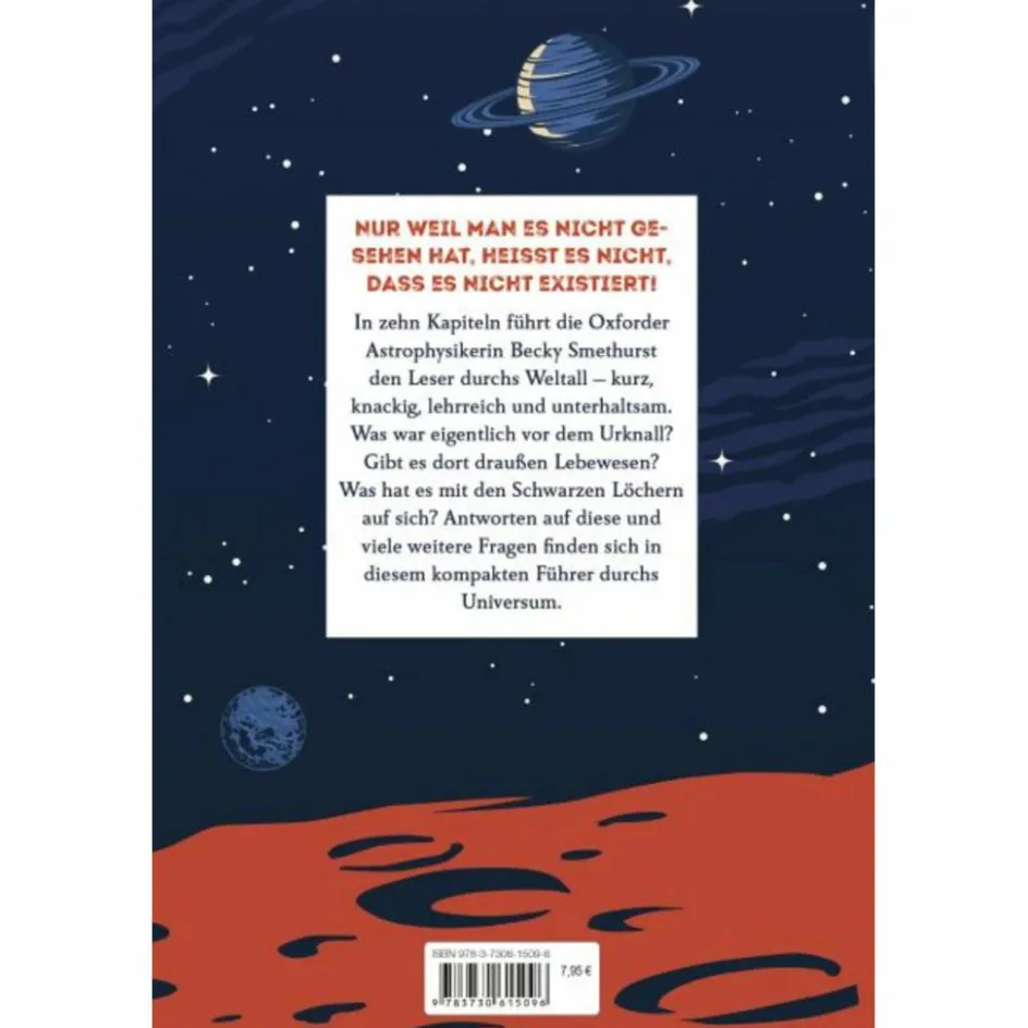 Nur weil man es nicht gesehen hat, heißt es nicht, dass es nicht existiert! In zehn Kapiteln führt die Oxforder Astrophysikerin Becky Smethurst den Leser durchs Weltall – kurz, knackig, lehrreich und unterhaltsam. Was war eigentlich vor dem Urknall? Gibt es dort draußen Lebewesen? Was hat es mit den Schwarzen Löchern auf sich? Antworten auf diese und viele weitere Fragen finden sich in diesem kompakten Führer durchs Universum.
