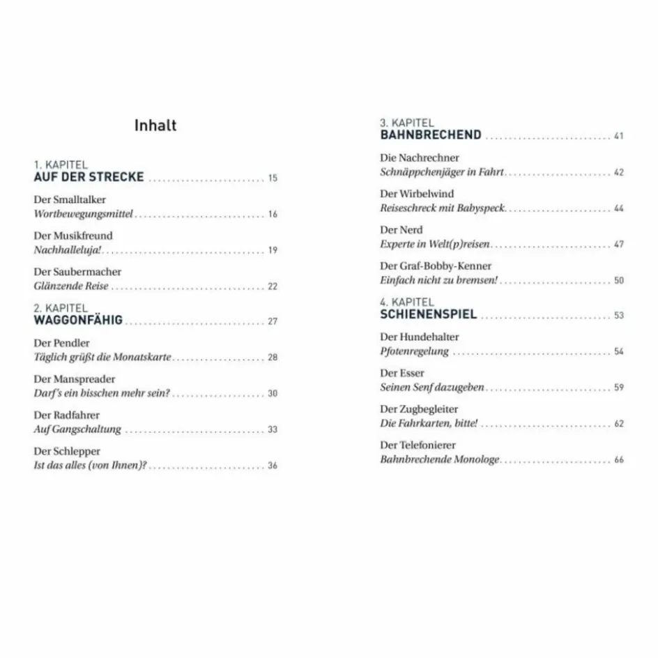 Wer öfter mit der Bahn unterwegs ist, kennt sie alle: die Smalltalker, die sich nie um ein Gespräch verlegen fühlen; die Pendler, die täglich mit grimmiger Routine ihren Platz verteidigen; die Esser, die genüsslich ihre Proviantboxen plündern … In dieser vergnügten Typologie der Bahngesellschaft werden die Eigenheiten und Marotten der Mitreisenden allesamt seziert und humorvoll aufs Korn genommen.