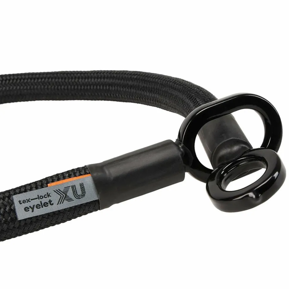 Praktische Kombi aus Eyelet und Bügelschloss; 2 verschieden lange Bügel sind inklusive. Das Eyelet hat eine angenehm textile Ummantelung. Dank Metallkern ist es resistent gegen Zerstörungsversuche.