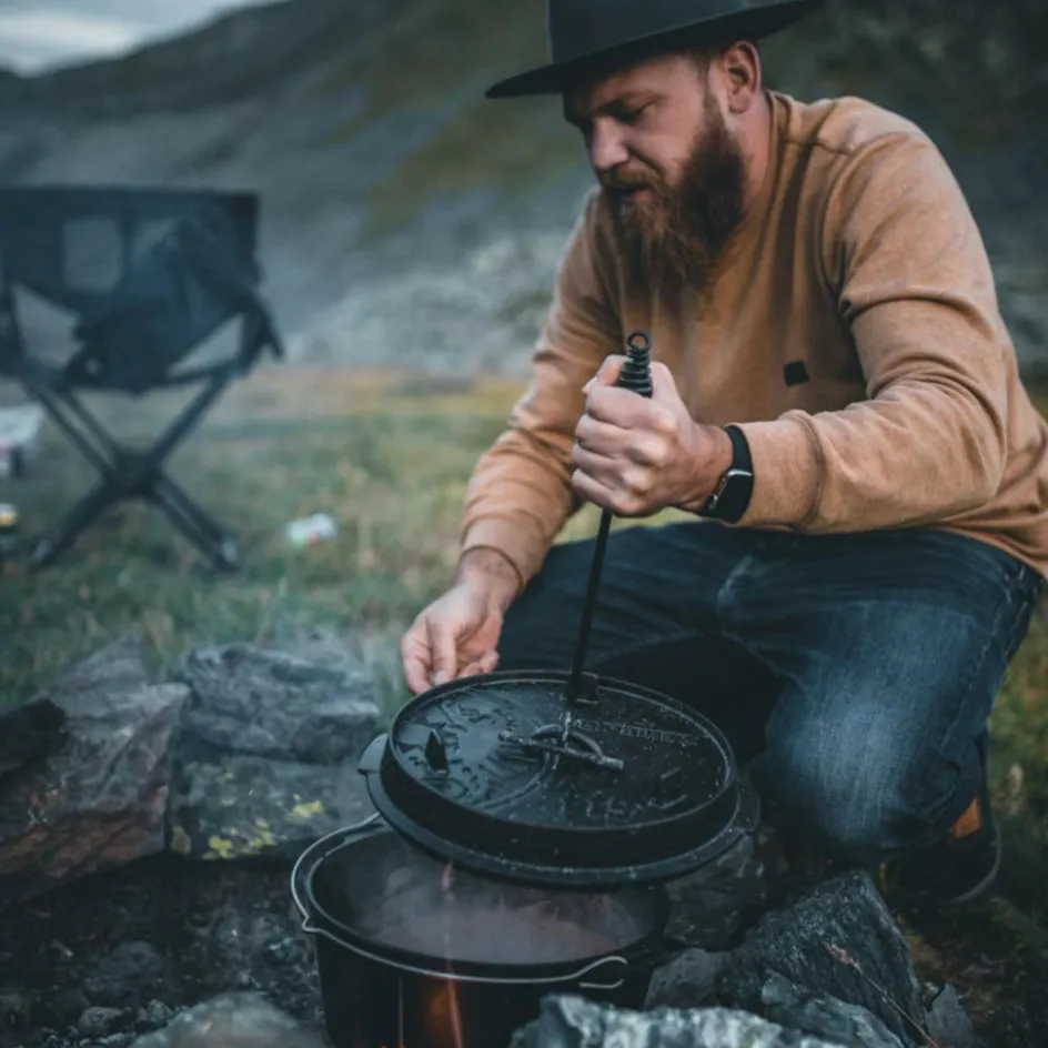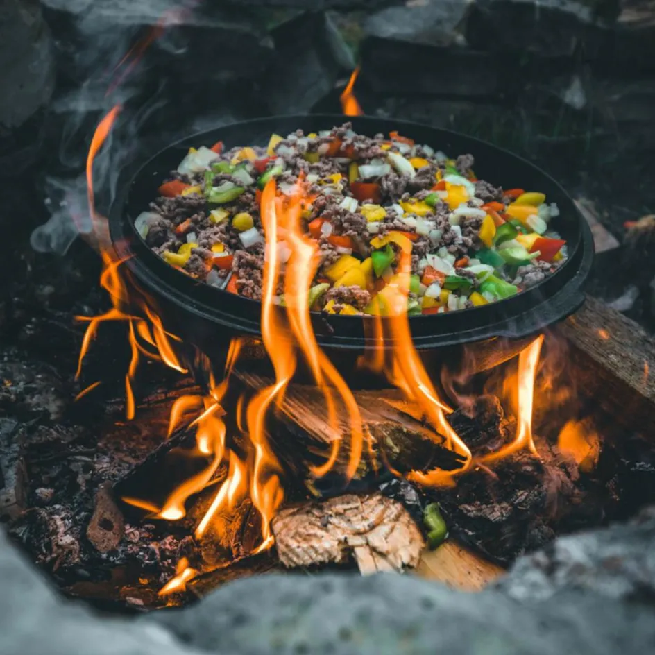 Schwerer Dutch Oven mit glattem Boden zur Zubereitung von Speisen über dem Lagerfeuer oder im Ofen. Er eignet sich zum Garen ebenso wie für leckere Eintöpfe, Suppen, Fleisch und Gemüse.