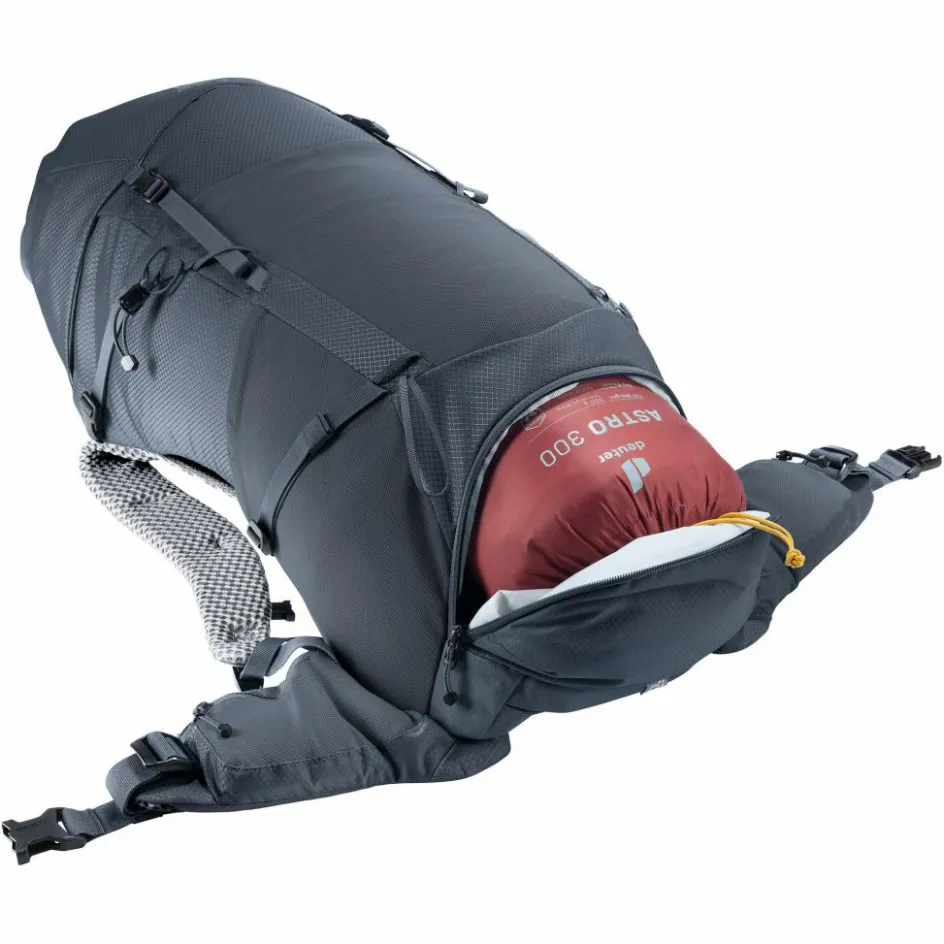 Die Raumaufteilung des Futura ist unverändert effizient geblieben. Deine Ausrüstung kannst du übersichtlich im Haupt- und zwei Deckelfächern unterbringen. Dabei lässt sich das Hauptfach auch bequem über einen Frontzugang öffnen, sodass du entspannt auch an weiter unten verstaute Dinge kommst. Die elastischen Netzfächer auf der Front und den Seiten eignen sich perfekt für Dinge, die du schnell zur Hand haben möchtest, zum Beispiel eine Regenjacke oder Trinkflasche. Für die Energieversorgung unterwegs musst du den Rucksack übrigens nicht abnehmen: RV-Taschen auf den Hüftflossen bieten unkomplizierten Zugriff auf Snacks oder Riegel. Eine Trinksystemaufnahme ermöglicht zudem die Verwendung einer Trinkblase (optional erhältlich).