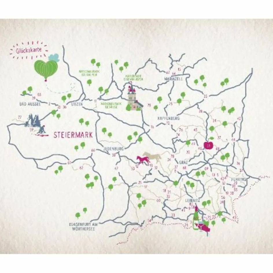 Der steirische Glückskompass führt zu hohen Bergen und dichten Wäldern im Norden, über vulkanischen Boden und zu heilsamen Thermen im Osten, durch hügelige Weingärten und grüne Aulandschaften im Süden und über weitläufige Almen im Westen. Auch abseits der bekannten Sehenswürdigkeiten gibt es viel zu entdecken, sei es Kunst aus dem Automaten oder ein stiller Ort mit Alpenpanorama. Laut oder leise, modern oder urtümlich: Die Steiermark ist ein Land voller Glücksorte!
