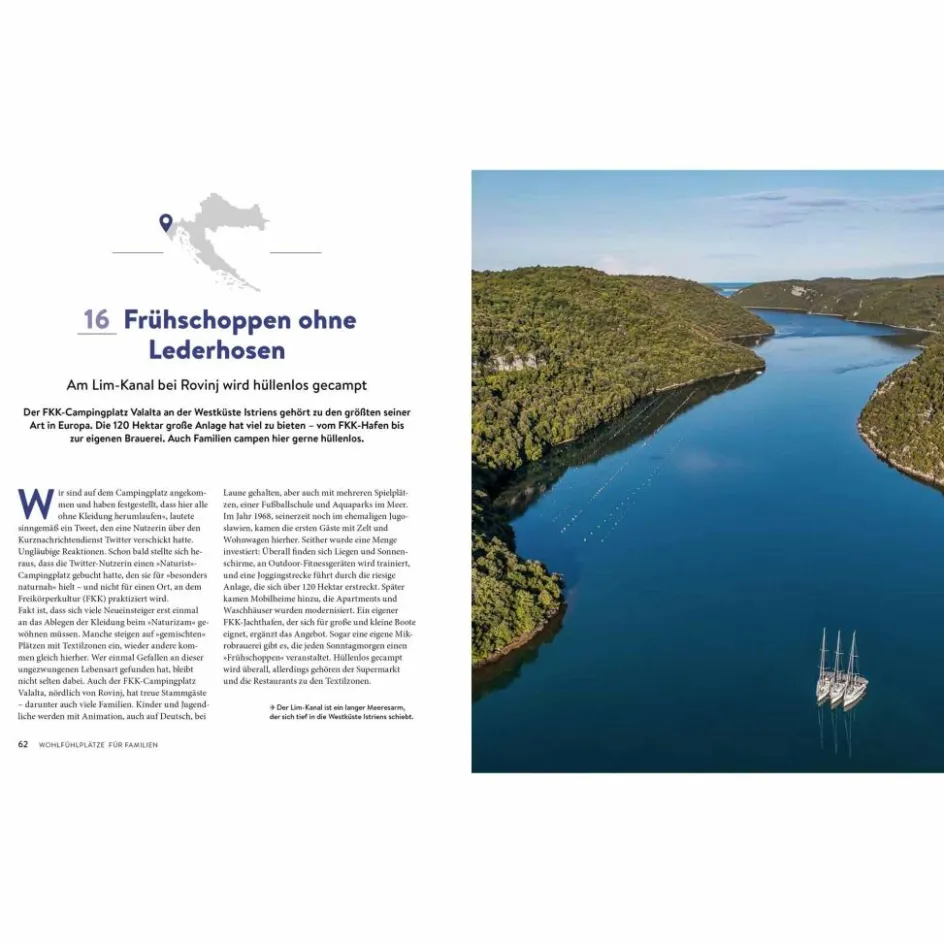 Ob im kompakten Zelt oder im großen Wohnmobil: erholsames Camping ist auf den richtigen Stellplätzen in Kroatien für jeden Urlauber möglich! Wer nach Kroatien zum Campen fährt, hat eher die Qual der Wahl als zu wenig Auswahl. Doch oft sind die Campingplätze riesig, laut und voll. Erholung ist da manchmal Fehlanzeige. Mit der kleinen, feinen Auswahl dieses Happy-Camping-Führers finden Erholungsuchende das, was sie möchten: kaum bekannte Plätze in Binnenkroatien, kleinere Camps an der Adria und auf den Inseln – und natürlich auch ein paar liebevoll ausgewählte FKK-Campingplätze.
