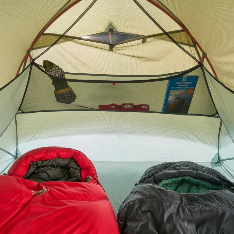 Dank steiler Seitenwände bietet dir das Innenzelt ein großzügiges Raumgefühl mit viel Kopffreiheit. Die hochgezogene Bodenwanne im Fuß- und Kopfbereich verhindert den direkten Kontakt zwischen Schlafsack und Außenzelt.