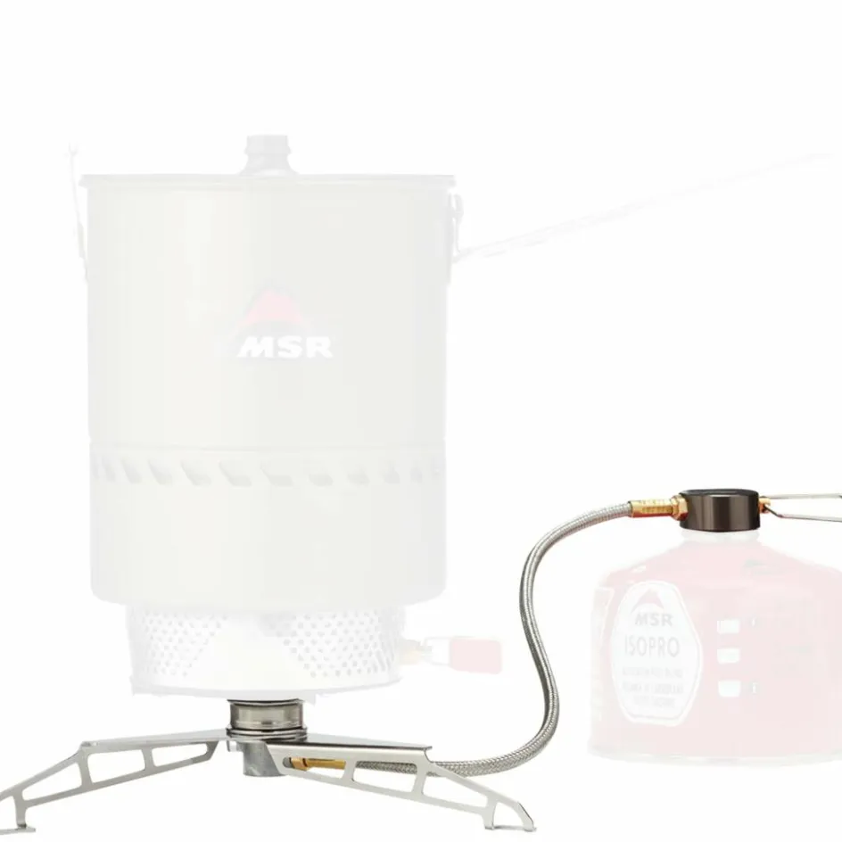 Spätestens wenn der Gaskocher auf einer großen 450-g-Gaskartusche verwendet wird, kann die Standsicherheit beeinträchtigt sein. Hier kommt der MSR Adapter zum Einsatz, auf dem du deinen Gaskocher aufschraubst. Die Standhöhe wird signifikant reduziert und die breiten Füße bieten auf jedem Untergrund eine feste Standfläche. Am Ende des Brennstoffschlauchs wird die Gaskartusche befestigt. Die Gaszufuhr wird über den Regler am Schlauch justiert (dafür bleibt das Ventil am Kocher geöffnet).