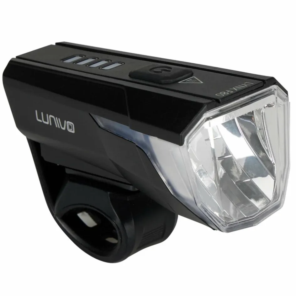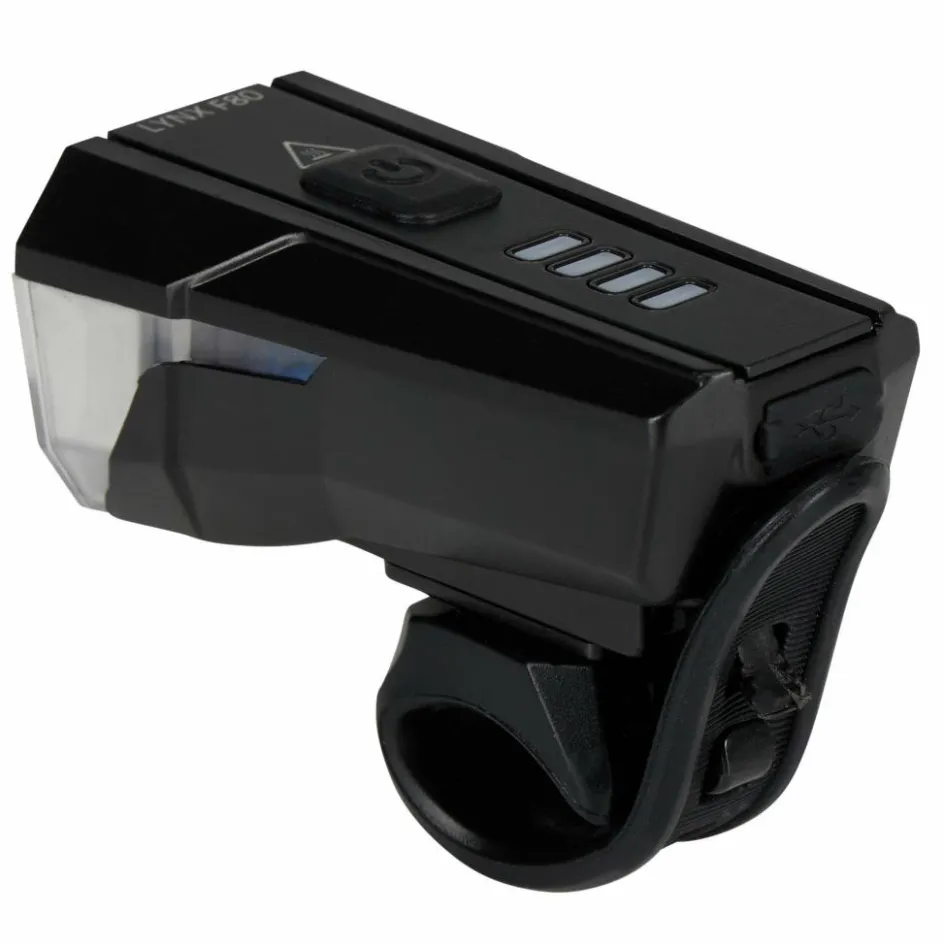 Der Lynx F80 Frontscheinwerfer liefert dir eine Lichtausbeute bis 80 Lux. Geht es hauptsächlich ums Gesehen-Werden im städtischen Bereich (und nicht so sehr ums wirkungsvolle Weg-Ausleuchten), lässt sich die Intensität der Frontlampe auch herunterregeln. Bis zu 20 Stunden Leuchtdauer stehen dir dann zur Verfügung. Bei Wegen ohne viel Straßenbeleuchtung sorgt ein großer Lichtkegel mit 80 Lux und bis 30 Meter dafür, dass du sicher vorankommst.