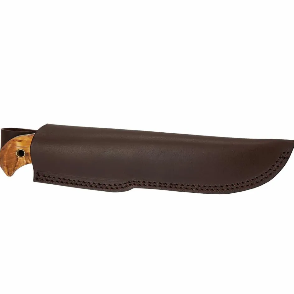 Der 12,4 cm lange Griff aus Maserbirkenholz ist poliert und geölt, wodurch die Maserung besonders schön zur Geltung kommt. Der geschwungene Knauf am Griffende verbessert das Handling beim Hacken. Ob Batoning, Schnitzen, Funken für das Lagerfeuer mit einem Feuerstahl schlagen oder Lebensmittel schneiden – das Nordlys stellt sich so gut wie jeder Aufgabe ohne Probleme.