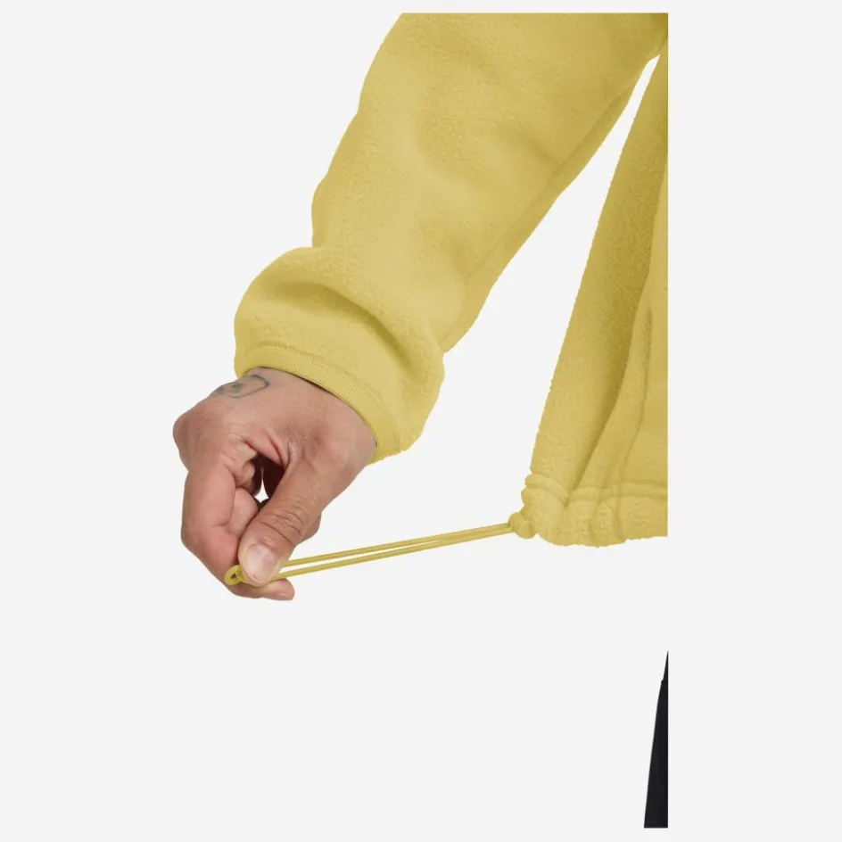 Der Fleecepullover besteht zu 100 % aus recycelten Polyesterfasern. Das weiche Material liegt sehr angenehm auf der Haut und speichert die Körperwärme effektiv. Außerdem trocknet das Fleece-Material rasant, wenn du beim Aufbau des Vorzeltes ins Schwitzen geraten bist. In diesem Fall kannst du auch den halblangen Front-Reißverschluss zur schnellen Abkühlung öffnen. Die lockere Passform und die überschnittenen Ärmel sorgen für volle Bewegungsfreiheit und einen sehr bequemen Sitz.