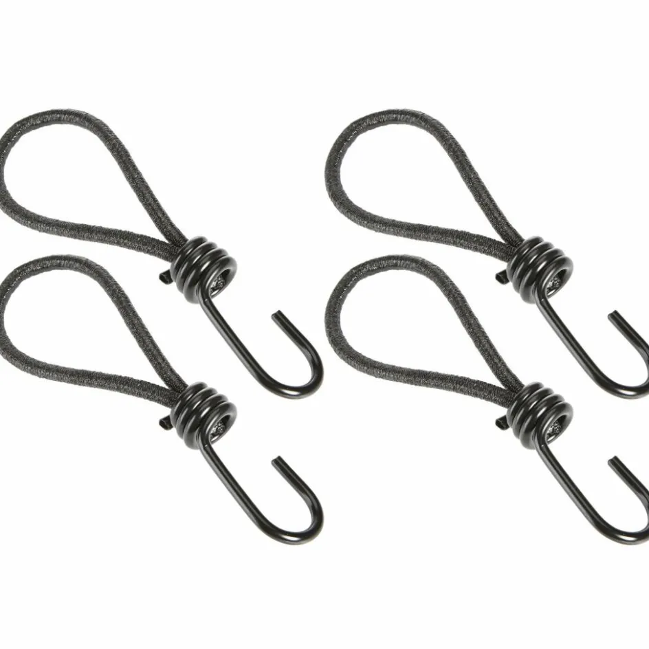 Vier stabile Spannhaken mit 6 cm langer Gummischlaufe und Metallhaken. Sie eignen sich zum Abspannen großer Zelte und Vorzelte, aber auch zum Sichern von Abdeckplanen. Inhalt: 4 Stück.