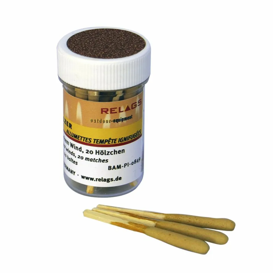 20 Streichhölzer sind in dieser kleinen Plastikdose untergebracht. Der Deckel mit Schraubverschluss und Reibfläche dichtet die Dose wasserdicht ab und dient als Zündfläche.