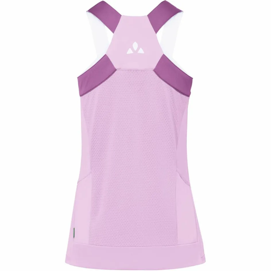 Die bequemen Träger umschließenden die Schulterblätter schön; das schnelltrocknende Gewebe aus recyceltem Polyester liegt angenehm weich auf der Haut und gibt Feuchtigkeit schnell ab. Zur optimalen Belüftung hat das sommerliche Top am Rücken ein weiches, luftiges Wabenmesh. Zwei offene, integrierte Rückentaschen und das dekorative Vaude Logo runden den Radsport-Look dieses Fahrrad-Tops ab.