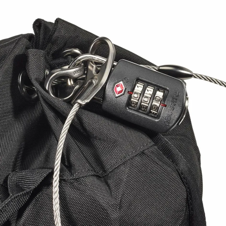 Mit dem mitgelieferten Zahlenschloss und dem hochfesten Stahlkabel kannst du den Travelsafe 12L GII Portable Safe an unbeweglichen Gegenständen, wie z.B. dem Hochbett im Mehrbettzimmer oder auch dem Strandkorb, anschließen und damit gleichzeitig abschließen.