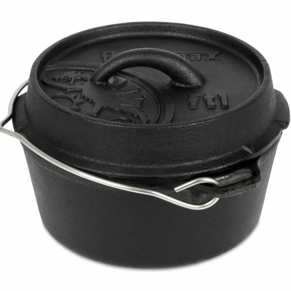 Kleiner Dutch Oven mit planem Boden mit dem du direkt über dem Feuer oder im Ofen leckere Gerichte zaubern kannst. Er eignet sich zum Garen ebenso wie für leckere Eintöpfe, Suppen, Fleisch und Gemüse.