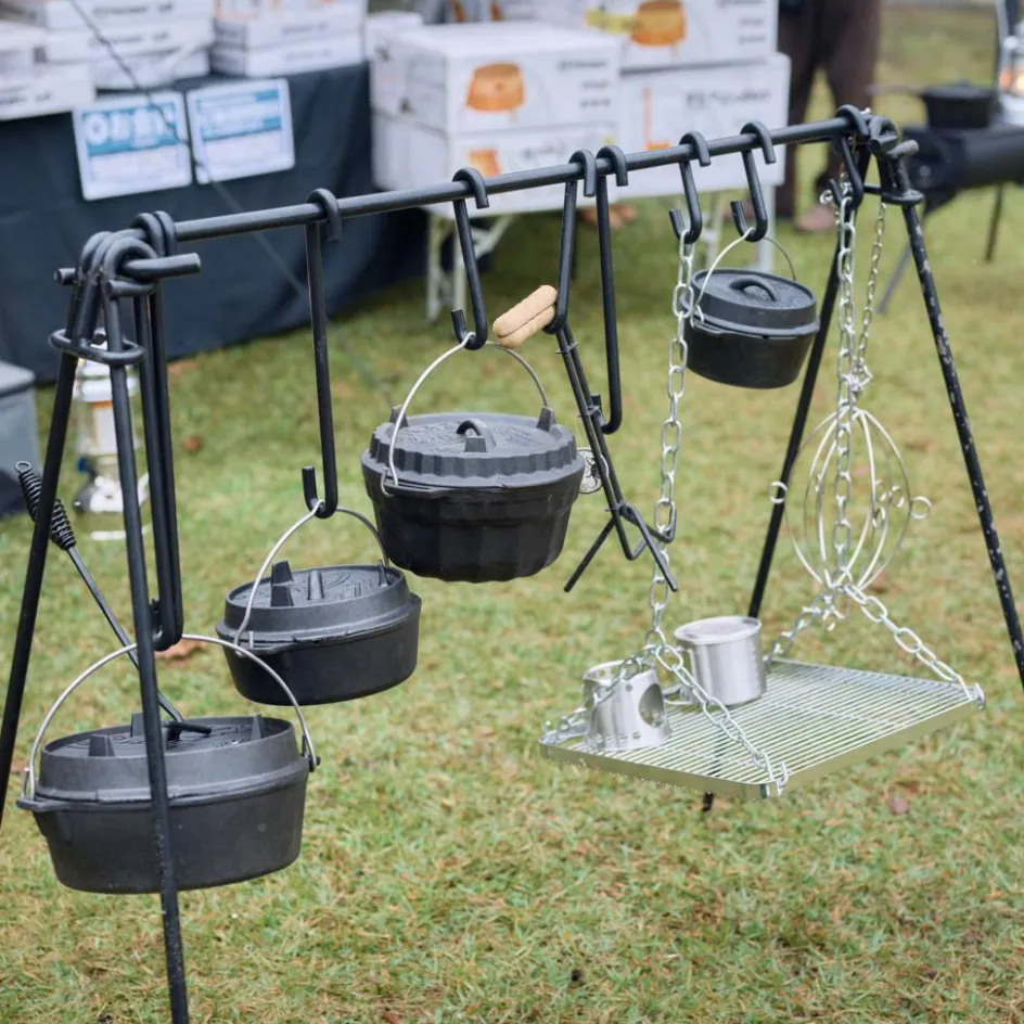 Das Gestell aus pulverbeschichtetem Stahl nimmt zerlegt wenig Platz ein, steht zusammengesteckt jedoch stabil über dem Feuer. An der 115 cm langen Querstange kannst du Töpfe nach Bedarf positionieren und so die Hitze optimal nutzen.