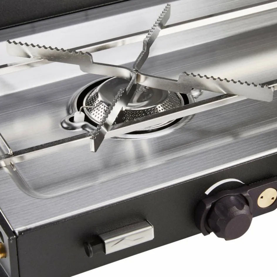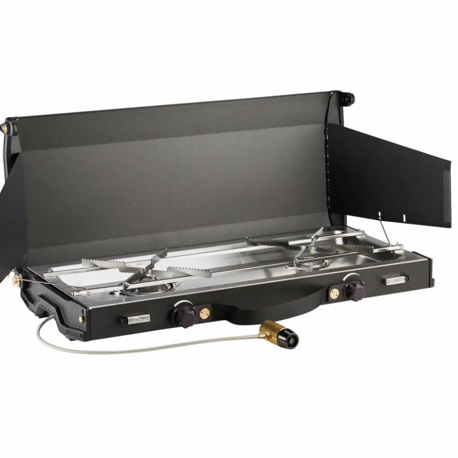 Mit einem Click auf den Piezo-Zünder entzündest du die Flamme. Jeder der beiden Brenner ist separat und feinfühlig regelbar und bieten eine Leistung von 3000 Watt. Der seitlich ausschwenkbare Wind- und Spritzschutz kann für besten Schutz in zwei Stufen fixiert werden.