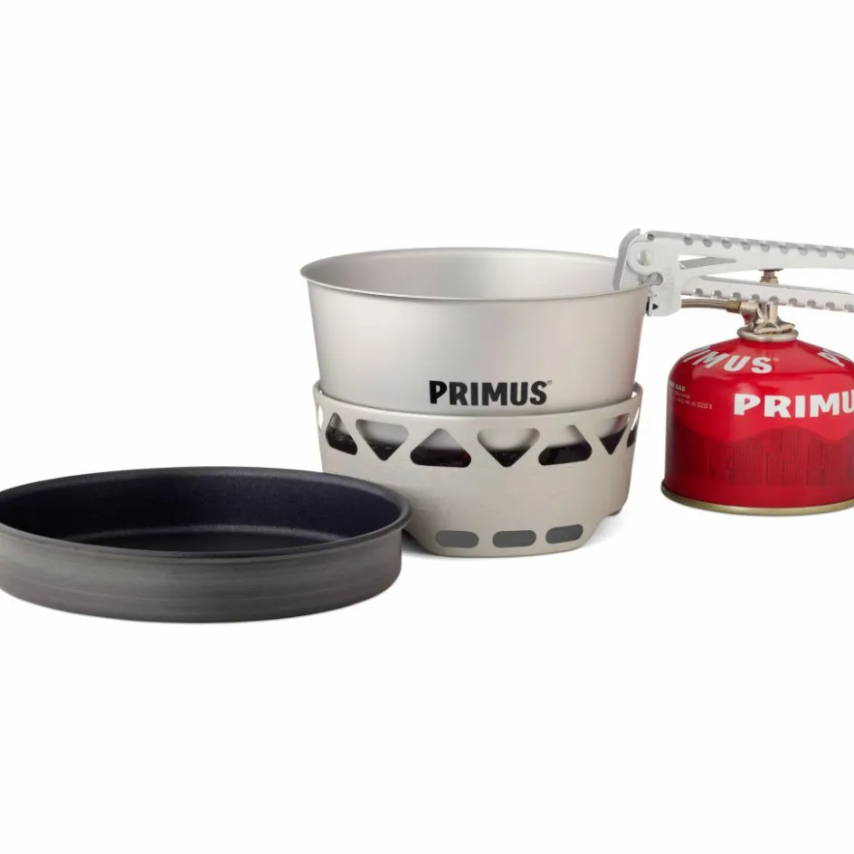 Brennstoffsparendes Kochset für eine Person. Die beiden 1,3 l Töpfe lassen sich ineinander stapeln und fassen anschließend den Brenner und die Griffzange. So kann alles kompakt verstaut werden.