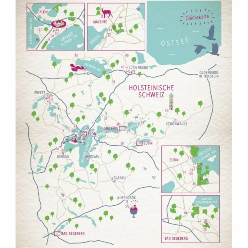 Schimmernde Seen, sanft geschwungene Hügel und ausgedehnte Wälder: Das sind die Glückszutaten der Holsteinischen Schweiz! Vom Frühstück mit Seeblick bis zum Sonnenuntergang am Fuße des Weinbergs warten von morgens bis abends einzigartige Genussmomente. Romantische Mühlen und kreative Ateliers öffnen ihre Türen; Eutin und Plön locken mit prächtigen Schlössern, verträumten Gärten und charmanten Cafés. In der Holsteinischen Schweiz wartet das Glück im, am und auf dem Wasser!