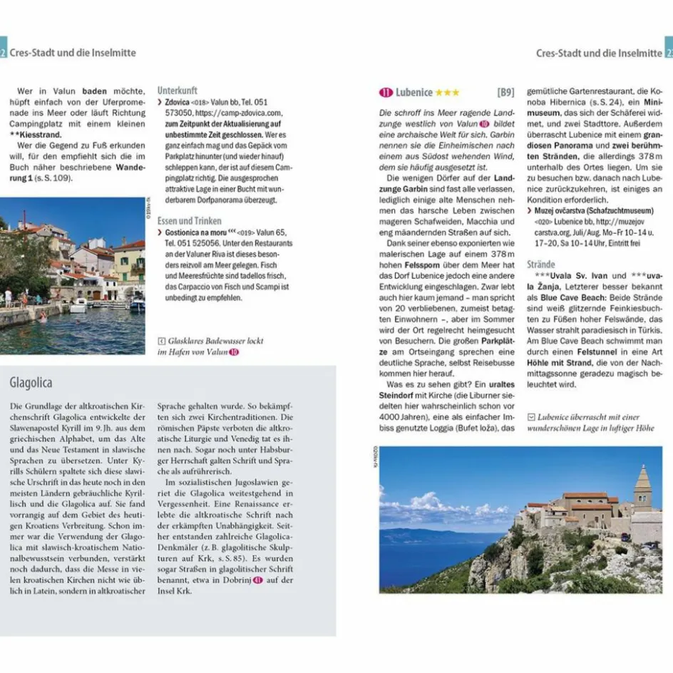 Dazu: kostenlose Web-App für Smartphone, Tablet und PC mit Inselplan- und Satellitenansichten passend zum Text, Routenführung zu allen beschriebenen Sehenswürdigkeiten und touristisch wichtigen Orten, Verlauf der Wanderungen, seitenbezogenen Updates nach Redaktionsschluss sowie einem Mini-Audiotrainer Kroatisch