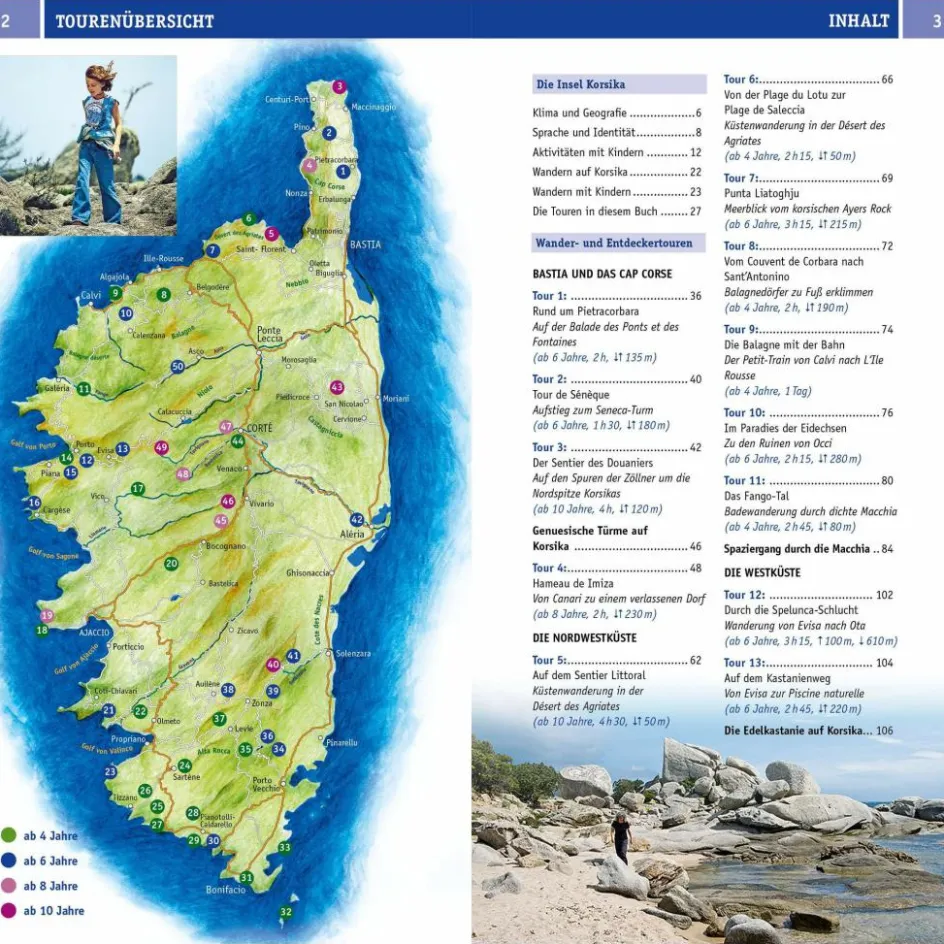 Korsika mit Kindern – Wasserfälle, einsame Flußtäler, wild-romantische Berge, malerische Dörfer, weiße Strände mit feinem Sand und türkisblauem Wasser. Korsika hat alles. Nur wenige Kilometer vom schönsten Strand entfernt, kann man in unberührter Natur wandern. Ein optimaler Urlaubsort für Familien. Das Buch enthält 50 Tourenvorschläge für Familien: vom Besuch im Schildkrötenpark oder im Hochseilgarten über einfache kurze Küstenwanderungen bis zur richtigen kleinen Bergtour. Auch ein Ausflug mit dem Kanu und eine Wanderung mit Esel sind dabei.
