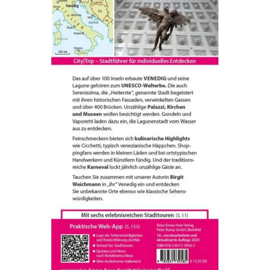 Dazu: kostenlose Web-App für Smartphone, Tablet und PC mit Stadtplan- und Satellitenansichten passend zum Text, Routenführung zu allen beschriebenen Sehenswürdigkeiten, Verlauf der Stadttouren, seitenbezogenen Updates nach Redaktionsschluss sowie einem Mini-Audiotrainer Italienisch. Alle Bücher werden regional in Deutschland produziert.