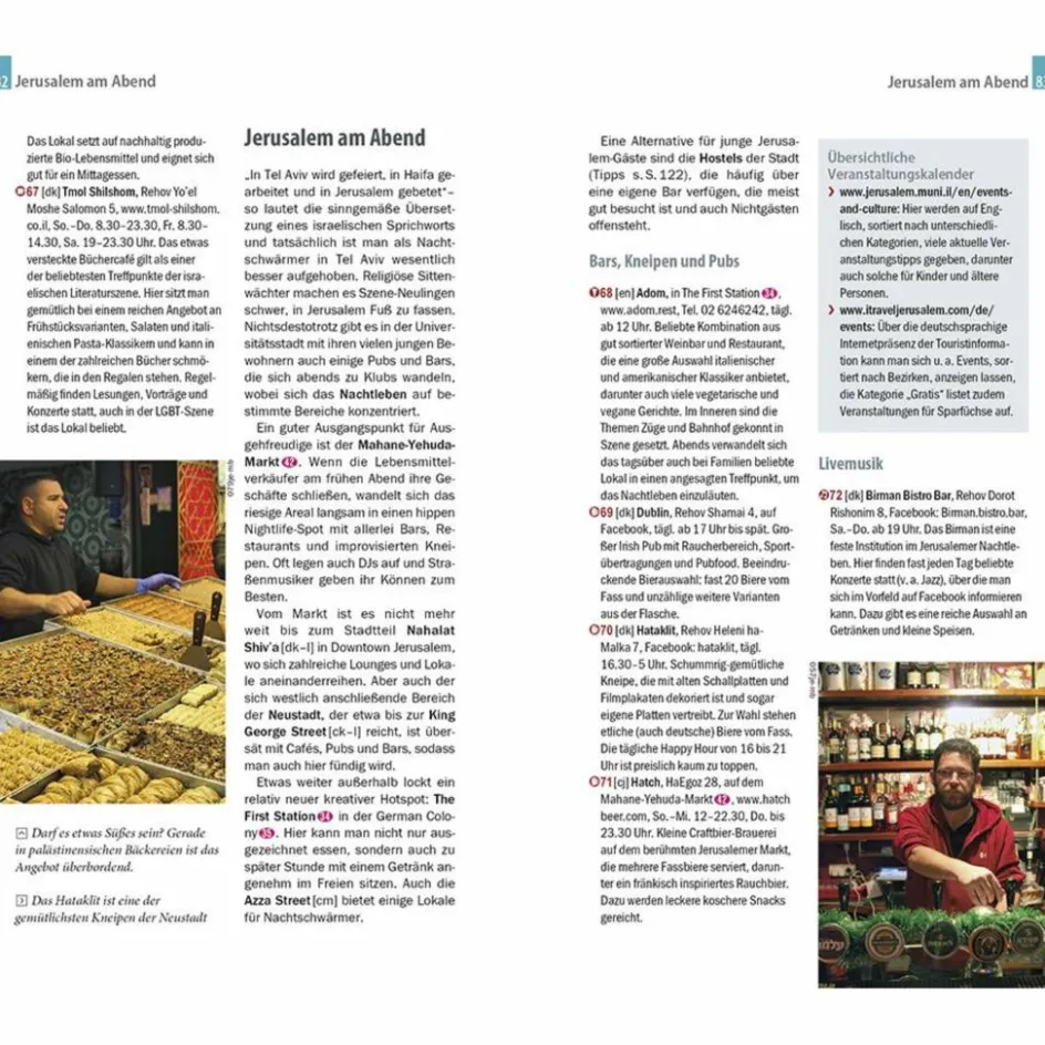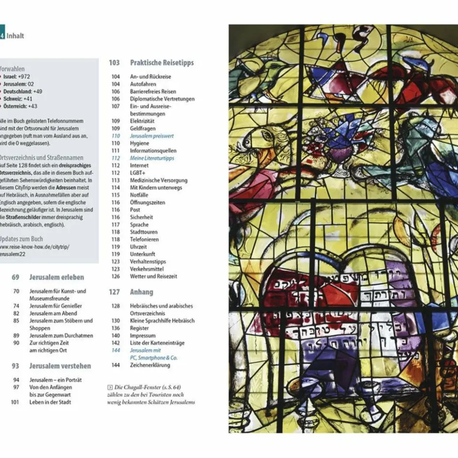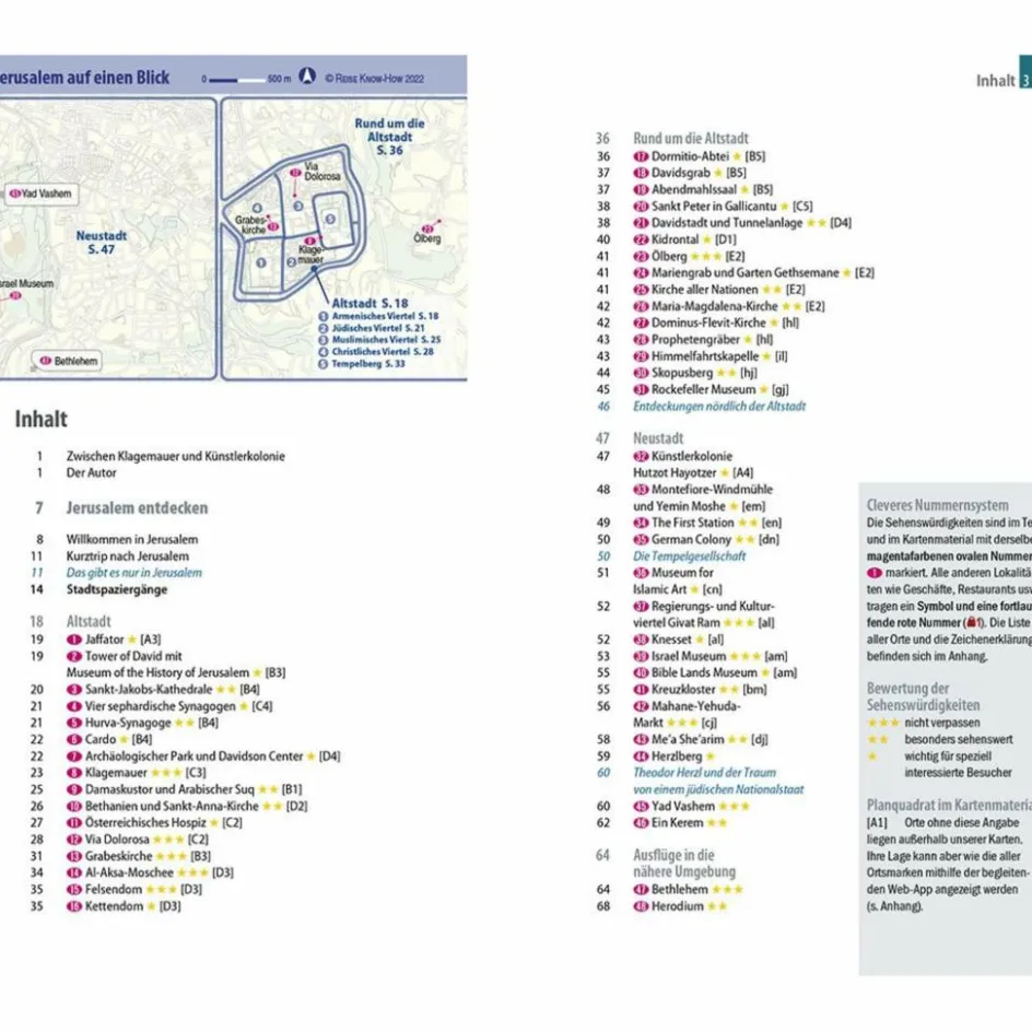 Shoppingtipps vom arabischen Suq bis zu modernen Shoppingmalls – Die besten Lokale der Stadt und allerlei Wissenswertes über die israelisch-arabische Küche – Tipps für die Abend- und Nachtgestaltung: vom Opernbesuch bis zur angesagten Studentenbar – Jerusalem auf den Spuren Jesu erkunden: Entdeckungen entlang der Via Dolorosa – Jerusalem zum Träumen und Entspannen: Sacherpark, Botanischer Garten, Biblischer Zoo – Ausgewählte Unterkünfte von preiswert bis ausgefallen – Alle praktischen Infos zu Anreise, Preisen, Stadtverkehr, Touren, Events, Hilfe im Notfall … –