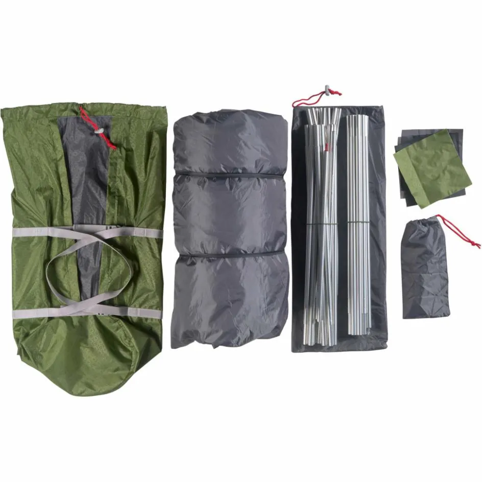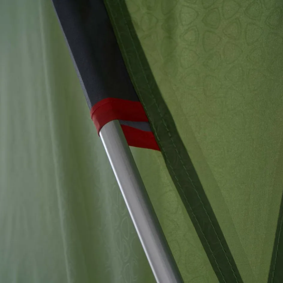 Der Aufbau gelingt dank der einfachen Konstruktion mühelos und ist von zwei Personen in wenigen Minuten erledigt. Ein zusätzlicher Gestängebogen spannt die Apside weit auf und sorgt für einen regengeschützten Eingang sowie eine vergrößerte Apsis. In ihr kannst du bequem sitzen oder Ausrüstung verstauen. Kleinere Gegenstände kannst du in den großen Netztaschen unterbringen, um Ordnung und Übersicht zu schaffen.