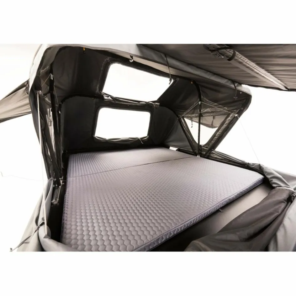 Das Zelt vereint die Vorteile eines Hartschalenzelts mit der großzügigen Liegefläche eines Faltdachzelts. Der Aufbau gelingt in unter zwei Minuten, auch allein, und das robuste Material schützt dich zuverlässig bei wechselhaftem Wetter. Die Matratze bietet auf 205 x 200 cm ausreichend Platz für mehrere Personen. Zusätzlich gibt es Stauraum am Kopf- und Fußende für kleinere Gegenstände. Für den Einsatz wird eine dynamische Dachlast von mindestens 100 kg benötigt, geeignet ist das Zelt für viele Kombis, SUVs und Busse.