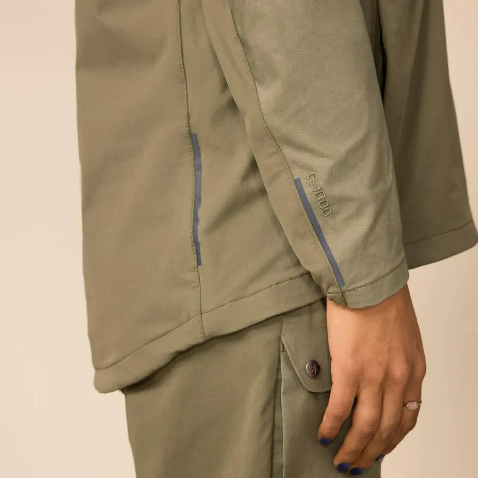 Das Material der Wahl ist beim S/F Räven Anorak W Fjällrävens G-1000 Lite Eco Stretch. Es ist angenehm leicht und dünn, aber dank dezenter Ripstop-Webart dennoch widerstandsfähig. Durch den leichten, mechanischen Stretch des leicht gewachsten Materials und durch das 4-Wege-Stretch-Nylonmaterial sitzt der S/F Räven Anorak W sehr bequem. Dafür sorgt auch der On-Bike-Fit von Specialized. Nachhaltig ist die Fahrradjacke übrigens auch, denn das verwendete Polyester ist recycelt und die Baumwolle stammt aus kontrolliert biologischem Anbau.