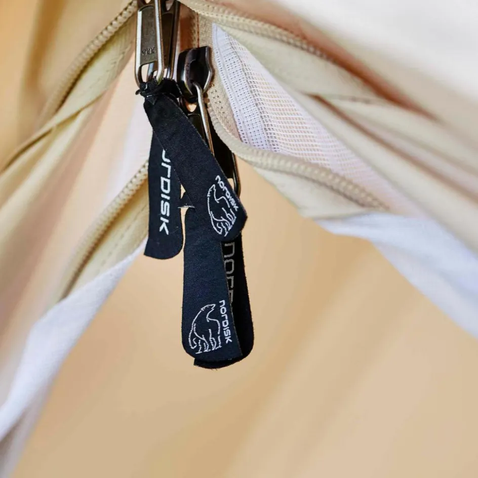 Der Eingangsbereich wird üblicherweise durch eine Schnur mit Kordelstopper fixiert, wenn er aufgerollt wird. Statt des Kordelstoppers aus Kunststoff kommen beim Asgard Eco 12.6 Schneckengehäuse zum Einsatz. In der Nacht, wenn der Eingang geschlossen ist, übernehmen die abdeckbaren Mesh-Fenster aus Jute die Belüftung.
