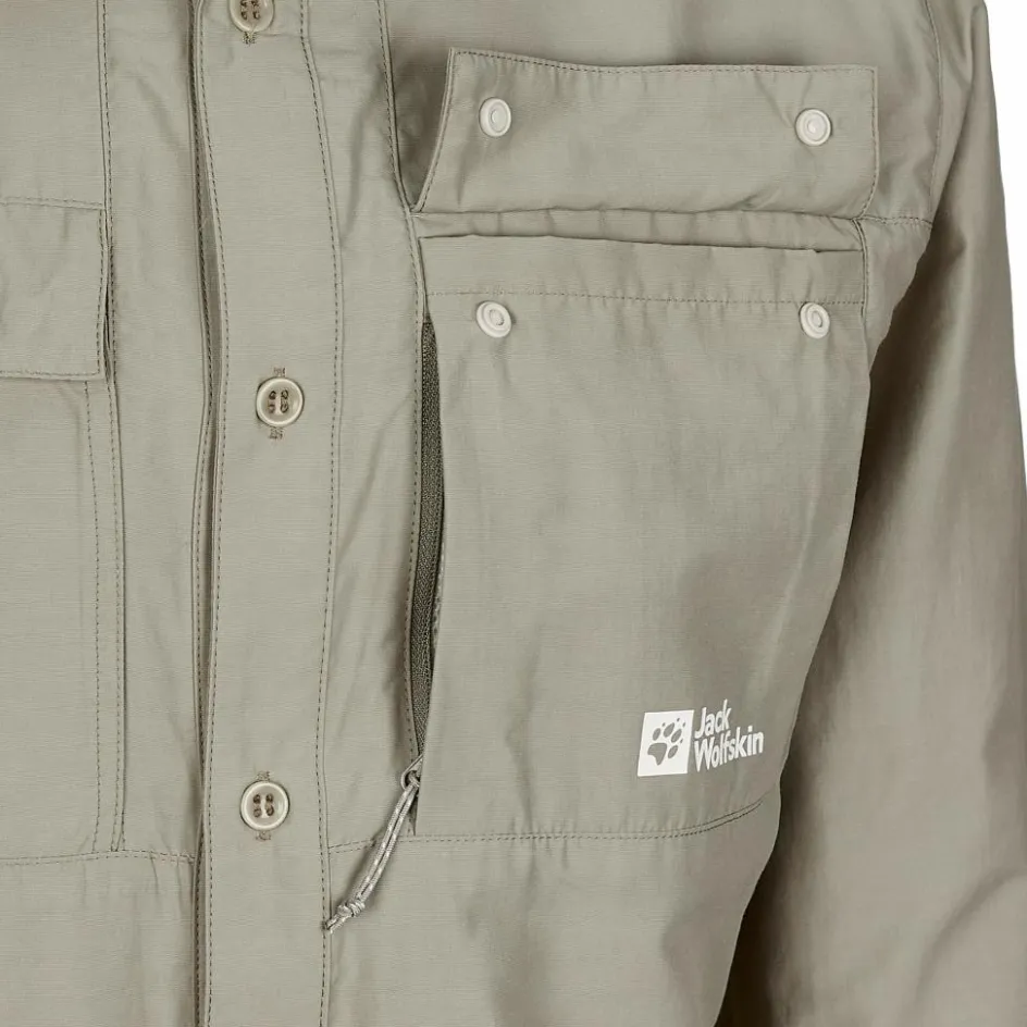 Ein zusätzliches Hindernis für Blutsauger stellt der Kragen dar. Dieser lässt sich ausklappen und mittels Knopf eng anliegend schließen. Die Ärmel sind ebenfalls mit Knöpfen ausgestattet und lassen sich im Bedarfsfall aufrollen. Für wichtige Habseligkeiten steht dir Platz in den drei Brusttaschen zur Verfügung.