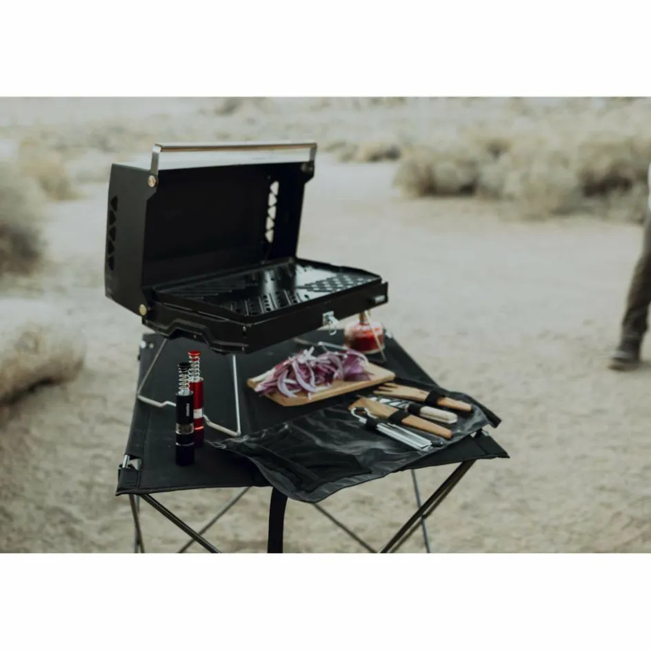 Alles am rechten Platz für die Outdoor-Küche! Diese schicke Tasche beinhaltet ein Küchenmesser, eine Reibe und Besteck: Koch-Spatel, Koch-Löffel und -Gabel sind aus robustem Eichenholz gearbeitet.