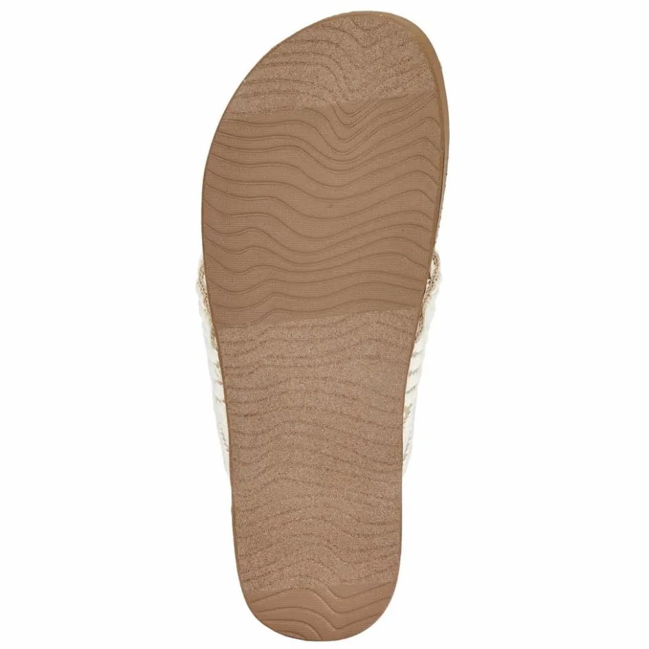 Die breiten Riemen sind kräftig gepolstert und mit weichem Synthetikgewebe unterfüttert. Für ausgleichende Standfestigkeit sorgt eine Gummilaufsohle mit flachem Profil.