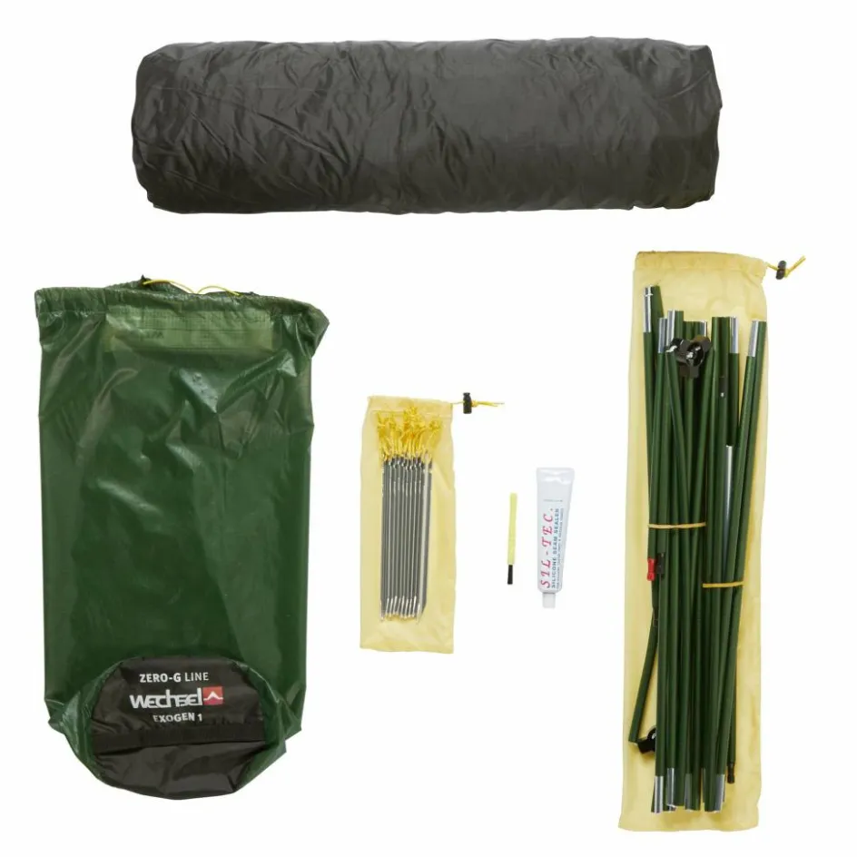 Exogen 1, Heringe, Abspannleinen, Reparaturhülse, Gestänge, Packbeutel