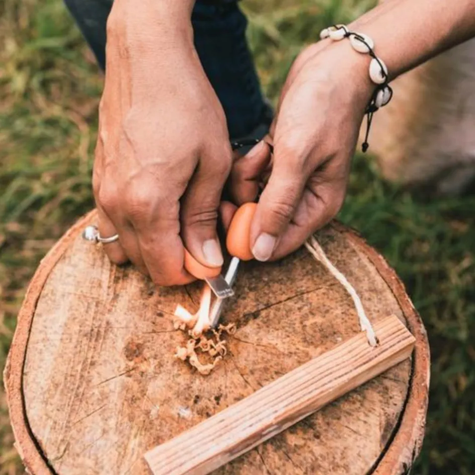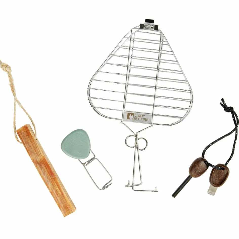 GrandPa’s FireGrill ist ein klappbarer Grillrost, der in seiner Mitte Würstchen, Fleisch oder Gemüse sicher und verlustfrei festhält. Mithilfe eines Stocks kannst du den Grillrost über die Glut halten. Geht es größeren Würstchen, Maiskolben oder Marshmallows an den Kragen, greifst du zu GrandPa’s FireFork Bio. Die Gabel wird ebenfalls an einem Stock befestigt und richtet dank ihrer Schutzkappe im Gepäck keinen Schaden an. Damit das Feuer überhaupt anfängt zu brennen, befindet sich ein Tinder-on-a-Rope (Fatwood) und ein Swedish FireSteel scout Bio (Feuerstarter) im Paket. Damit kannst du bei jeder Witterung ein Feuer entfachen.