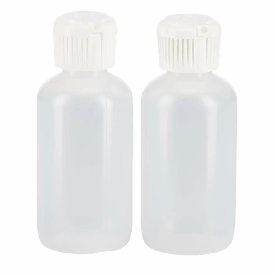 Zwei kleine Kunststoffflaschen mit 50 ml Volumen. Der Klappausgießer ermöglicht eine gute Dosierung und verhindert ein Auslaufen des Inhalts. Ideal für Shampoo, Spülmittel, Flüssigseife…