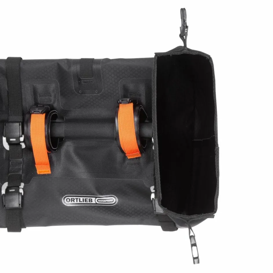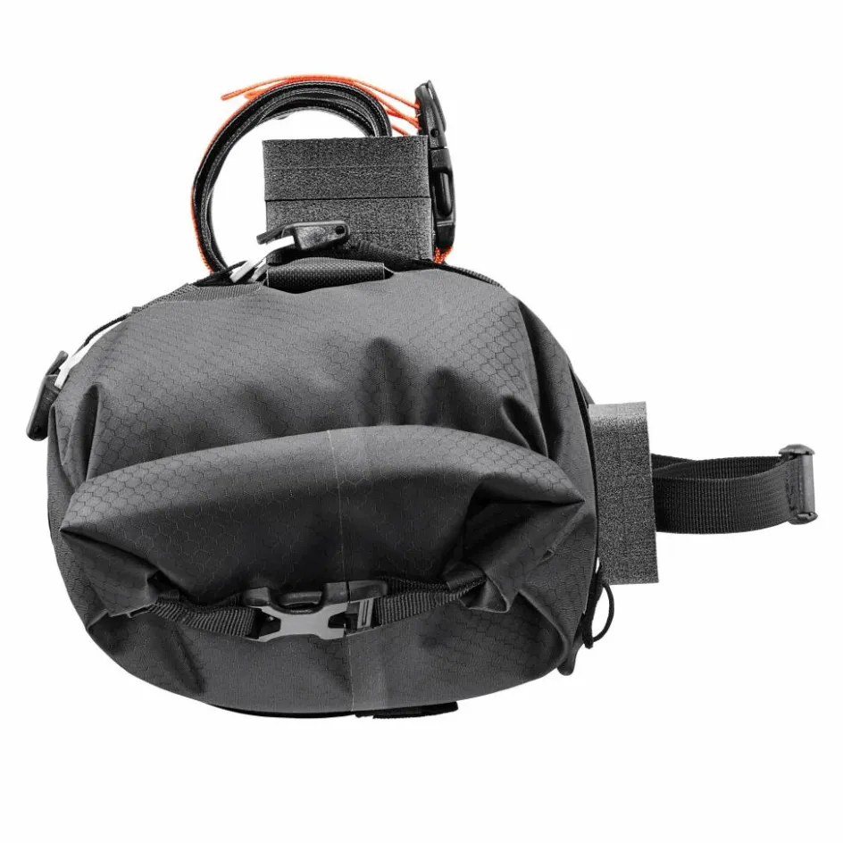 Lenkertasche für die Montage an allen Lenkertypen. Mit seitlichem Rollverschluss, Kompressionsventil und starken Gurten zur Fixierung. 9 l Taschenvolumen.