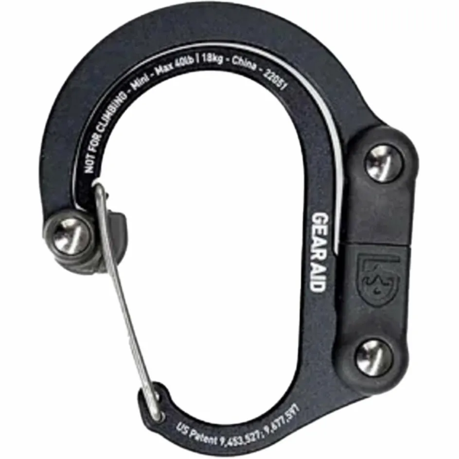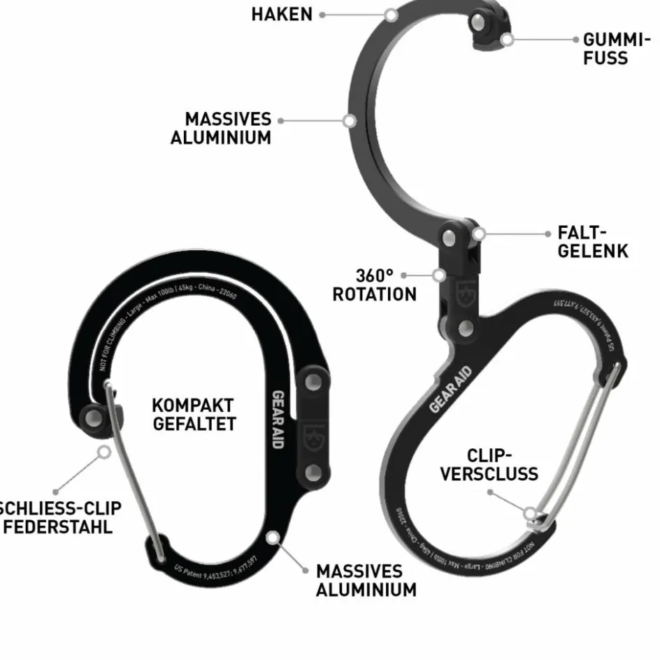 Mit dem Hero-Clip ist ein Karabiner mit klappbarem Haken. Mit ihm lassen sich zu Hause und unterwegs größere Ausrüstungsgegenstände aufhängen und durch das Drehgelenk platzsparend verstauen.